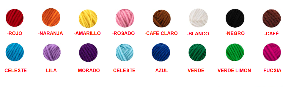 | Lana | Amarillo, Azul, Blanco, Cafe, Celeste, Fucsia, Lila, Naranja, Negro, Rojo, Rosado, Verde, Verde claro, Violeta |